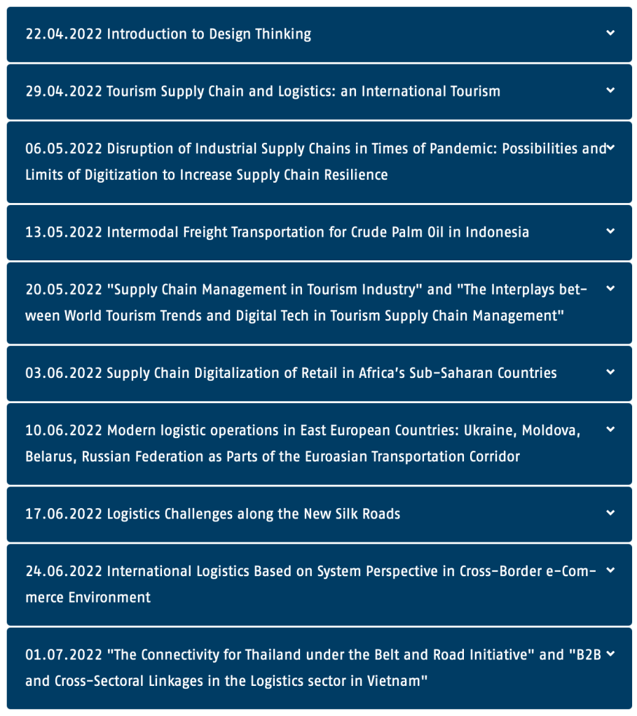 From April to July 2022, the Lecture Series in International Logistics provides an exciting opportunity to explore current topics in the field of international logistics. The sessions take place every Friday from 9:15 to 10:45 a.m., featuring guest lecturers from various countries. Topics include supply chain management in the tourism industry, logistical challenges along the New Silk Road, design thinking, and many more relevant issues. Each lecture is followed by an engaging discussion, where participants can raise questions and exchange ideas with the speakers.